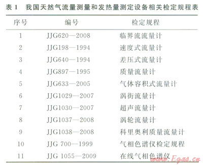 針對體積流量和發熱量測量設備量值溯源與傳遞管理,我國制定了相關的檢定規程11項(表1)。同時,GB/T 28766—2012《天然氣在線分析系統性能評價》(修改采用ISO 10723)為在線色譜分析系統性能評價提供了標準方法[5]。GB/T l8603—2001《天然氣計量系統技術要求》為流量和發熱量測量系統性能評價提供了判定依據[6]。