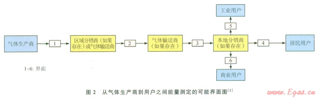 GB/T 22723《天然氣能量的測定》提出從氣體生產商到用戶實施能量計量的6個可能界面(計量站),如圖2所示。一般來說在1、2、3界面通常采用天然氣在線組成分析和流量測量。而4、5、6界面通常采用發熱量賦值和流量測量。