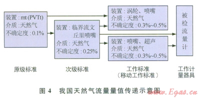 我國建設了原級標準裝置、次級標準裝置、工作標準裝置、移動標準裝置,建立了完整的流量量值動態溯源鏈(圖4)。國家石油天然氣大流量成都和南京分站共同構成完整的低、中和高壓體積流量量值傳遞和溯源鏈。成都和南京分站的質量時間(mt)法原級標準裝置,不確定度優于0.10%。成都分站擴容改造后,將建立中低壓(0.3~6.0MPa)、質量流量不確定度達到(0.05%~0.076%)的原級標準裝置。同時成都分站正新建環道檢測系統作為工作標準,將現有臨界流文丘里噴嘴次級標準裝置從不確定度0.33%水平提高到小于等于0.20%。