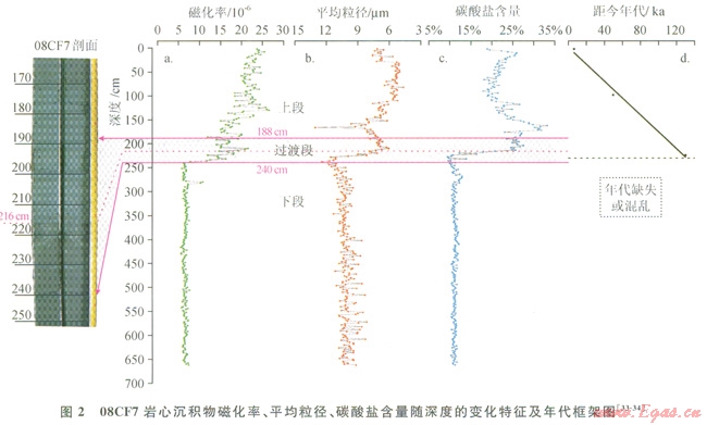08CF7巖心在琴叁和取樣過程中未遭到人為破壞,且未見明顯生物擾動痕跡,因此能較好地指示其原位沉積特征。巖心觀察發(fā)現(xiàn),沉積物白頂向下以216cm處為界,上部為灰黑色,下部為淺黑色,交界面呈相互穿透狀,整段巖心的沉積物類型均為黏土質(zhì)粉砂。筆者在前期的研究中已對巖心沉積物進行粒度、磁化率和碳酸鹽含量測定和分析[34-35],將結(jié)果進行綜合對比和分析,發(fā)現(xiàn)這3項指標均呈現(xiàn)出相似的變化趨勢,可分為3段:①0~188cm段,各項指標變化較大,以磁化率值高,沉積物粒度小及碳酸鹽含量高為特征;②188~240cm段,為各項指標和沉積物巖性變化的過渡段;③240cm以下,各項指標呈現(xiàn)均一性變化,相對以磁化率值低,沉積物較粗及碳酸鹽含量低為特征(圖2)。