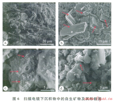 自生碳酸鹽礦物主要呈細粒狀發(fā)育在沉積物中,在掃描電子顯微鏡下,原樣中的文石呈針狀生長在沉積物中(圖6-a),沒有發(fā)現(xiàn)沿孔隙生長的簇狀文石,而在細粒組分中,文石呈碎屑狀出現(xiàn)(圖6-b)。白云石呈微晶狀發(fā)育在黏土團塊中(圖6-c),周圍有l0mm的滲漏微孔。在原樣中沒有觀察到方解石顆粒,但在細粒組分中可觀察到方解石呈棱形體零星地散布在細粒組分中(圖6-d),顆粒一般為2~15mm。這些觀察表明,沉積物中發(fā)育自生碳酸鹽礦物,但其顆粒細小且分散在沉積物中,未發(fā)育成塊狀碳酸鹽巖。