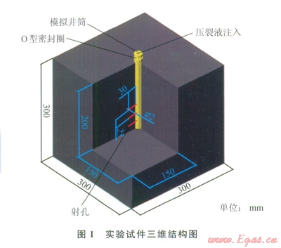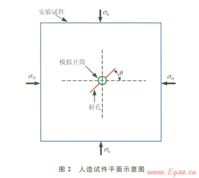 以上情況與定向射孔參數(shù)和目標(biāo)地層性質(zhì)(地應(yīng)狀態(tài)、地層非均勻性等)密切相關(guān)。然而目前對此問研究甚少。筆者采用大型真三軸水力壓裂物理模擬驗系統(tǒng)[13]進(jìn)行了室內(nèi)物模實驗,研究了定向射孔水壓裂人工水力裂縫的形態(tài)和影響因素,并對完井和裂施工提出了一些工程建議。