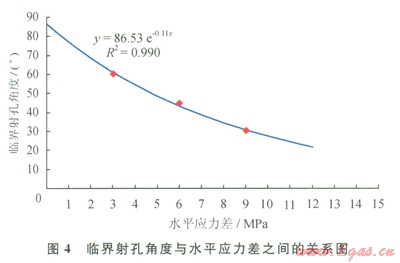 利用本壓裂模擬實驗結(jié)果,可回歸出產(chǎn)生非對稱多裂縫系統(tǒng)的臨界射孔角度和水平應(yīng)力差的相互關(guān)系曲線(圖4)。當(dāng)水平應(yīng)力差和定向射孔方位角的坐標(biāo)落在藍(lán)色臨界線的左下側(cè)時,人工水力裂縫會沿定向射孔方向起裂,形成一條基本對稱的雙翼平直裂縫或雙翼彎曲裂縫;當(dāng)水平應(yīng)力差和定向射孔方位角的坐標(biāo)落在藍(lán)色臨界線的右上側(cè)時,人工水力裂縫會沿著最大水平地應(yīng)力方向起裂,產(chǎn)生一條穿過微環(huán)面的雙翼平直裂縫;當(dāng)水平應(yīng)力差和定向射孔方位角的坐標(biāo)正好落在藍(lán)色臨界線上時,人工水力裂縫可能沿著定向射孔方向和最大水平地應(yīng)力方向多點同時起裂,形成非對稱多裂縫系統(tǒng)。該預(yù)測結(jié)果與本文參考文獻(xiàn)[3]的有限元模擬計算結(jié)果比較一致。運用該圖可以用來預(yù)測定向射孔水力壓裂裂縫形態(tài),為現(xiàn)場壓裂施工提供參考。但鑒于實際地層因素和完井因素的影響,實際的臨界射孔角度可能會有所變化。