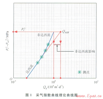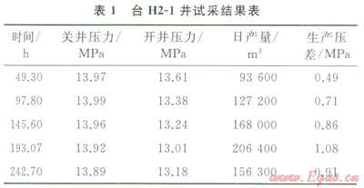 接著用采氣指數法對該井進行滲流動態描述[3]。該方法主要根據滲流力學原理,將氣體滲流控制在達西流的范圍內,以達到保護儲層、避免出砂的目的。根據臺H2-1井的試采數據,其臨界點在生產壓差lMPa(即地層壓力的7%左右),在此生產壓差下其日產量為16×104m3,也即理論上的最高配產量(圖1)。