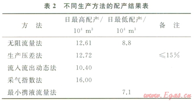 氣井的最小攜液產量也是配產的重要考慮參數。該參數用以保證氣井生產時井筒不產生積液。臺H2-1井分別采用73mm、60.3mm、48.3mm這3種規格的油管進行模擬計算,得出其最小臨界攜液日產量分別為7.1×104m3、4.9×104m3和3.2×104m3。目前該井使用的為73mm油管,確定其最小臨界攜液流量為7.1×104m3/d。通過以上幾種方法配產方法,其匯總結果如表2所示。