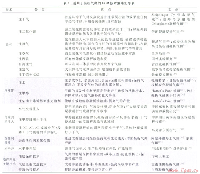 6)表2中雖然列出了現發表的EGR技術,有些還處于評價研究階段,還未投入現場應用,應用時要針對具體的氣藏情況,考慮現有技術和經濟條件來確定是否值得實施。