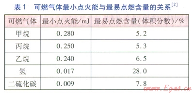 最小點火能指能夠引起可燃氣體與空氣混合物燃燒或爆炸的最小火花能量,單位為mJ,通常用來衡量可燃氣體混合物的點火敏感度。最小點火能不僅與可燃氣體的種類有關(guān),而且與可燃氣體的含量、點燃源的種類有關(guān)。當可燃氣體達到最易點燃含量時,其點燃能量最小。可燃氣體最小點火能與最易點燃含量的關(guān)系見表1。表l中的最小點火能是用電火花裝置測量得到的。