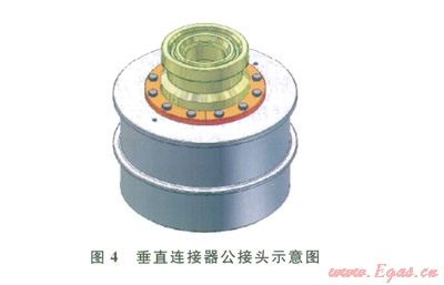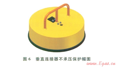 垂直連接器的公接頭一般安裝在管匯/采油樹上,母接頭裝在跨接管上、安裝時與公接頭對接(圖4、5)。水下連接器保護帽分為不承壓和承壓兩種形式(圖6、7)。不承壓保護帽對水下連接器的公接頭起到保護作用,也可隨著接頭安裝到水下,一般建議在水下的停留時間不超過42d。承壓保護帽可用于長期的公接頭保護(期限與公接頭使用壽命相同),根據密封形式的不同,也可用做隔斷使用,即橡膠密封的承壓保護帽可用作二級隔斷使用,金屬密封的承壓保護帽可用作一級隔斷使用。