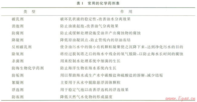 海上油氣田的開發都離不開化學藥劑,這些藥劑主要用來添加到生產流體、海水等介質中,以此來提高各有關處理設備的處理效率,保護設備與井口管線,以及延長設備的使用壽命等。常用的化學藥劑如表1所示。