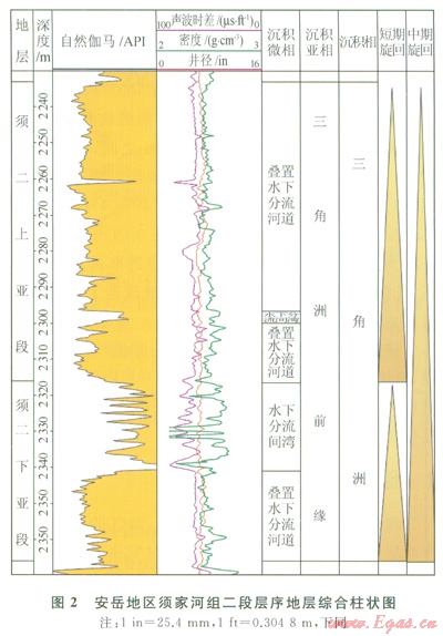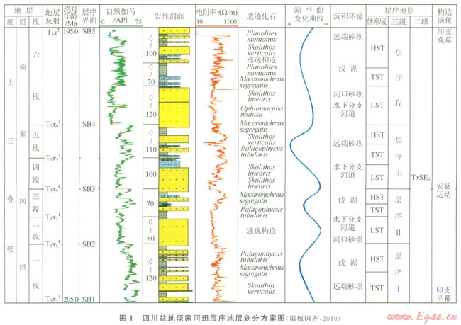 四川盆地川中地區須家河組劃分為4個三級層序,每個層序可進一步識別出低位、水進和高位3個體系域,其中低位體系域以三角洲相為主,水進和高位體系域則以湖泊相為主,該區須二段總體上位于低位體系域[4](圖1)。