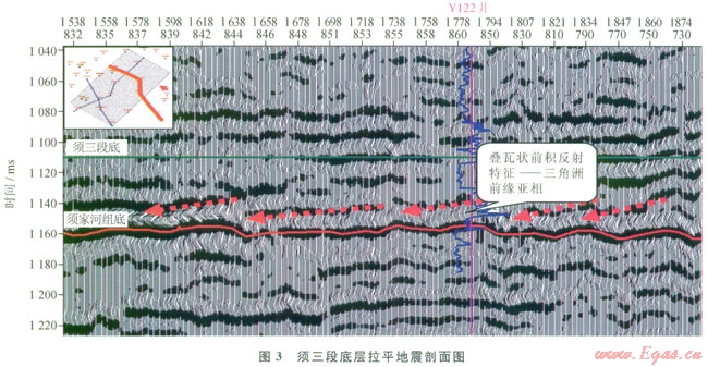 地震相主要是通過地震反射外部幾何形態、內部反射結構、振幅、連續性、波形排列以及視頻率等特征進行識別與劃分。在區域最大湖泛面(須三段底)拉平地震剖面上,對于整個須二段可見清晰的三角洲前緣亞相疊瓦狀前積反射結構,兩個平行的反射層之間存在幾組傾斜的、疊瓦狀排列的同相軸(圖3),可作為判斷物源方向的依據。但對該區須二上亞段20~30ms小時窗內(厚度50~85m),地震微相特征不明顯,后續沉積微相的劃分需要借助地震屬性的分析。