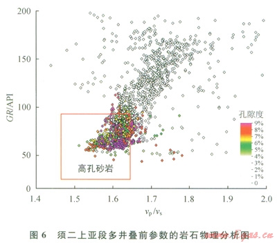安岳地區須二上亞段主要為高孔砂巖、致密砂巖和泥巖,從疊后參數的巖石物理分析結果看,伽馬、速度、孔隙度各類樣點值分散、疊置,常規屬性難以區分出高孔砂巖(圖5)。
