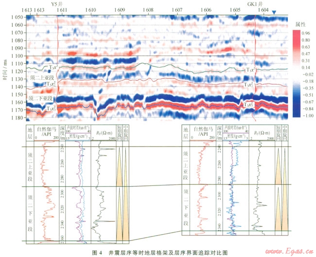 由于河湖相地層橫向變化大,而層序界面的追蹤對比必須是等時的、精細的,因此,在單井層序劃分的基礎上,以區內8口典型井合成地震記錄為橋梁,以波形、波組特征以及能量的相關性為識別依據,在高分辨率處理的地震資料上進行層序界面的對比追蹤,最終建立該區須二段等時地層格架,確保了后續地震屬性的準確提取。圖4是以Y5、GKl井為例的連井解釋剖面。