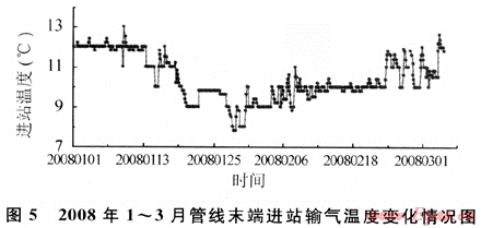 為保證該管線冬季不發生水合物堵塞,從2007年11月27日開始,作業區采用緩蝕劑加注泵間歇式加注乙二醇,每間隔2h加注1次,每次加注30min,每天加注50kg左右;該生產期間,平均氣溫為9.37℃,管線末端輸氣溫度在10~12℃。從2008年1月4日開始進行動力學抑制劑GHI-1現場試驗,采用連續式加注,白天(8:00~20:00)泵排量為21%,晚上(20:00~8:00)泵排量為25%,每天藥劑加量控制在13~16kg。此期間平均氣溫降至0~5℃,最低氣溫達-3℃,管線末端輸氣溫度在8~10℃。生產和試驗期間,藥劑加注量如圖3所示,管線輸氣量、首末兩端壓差、輸氣溫度等生產運行情況見表2和圖4、5所示。