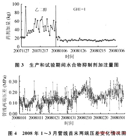 由于該天然氣水合物形成溫度較高(7.0MPa輸壓條件下的水合物形成溫度為18.60℃),投產初期井站節流閥、分離器等地面設備、生產管線及下游井站閥門、分離器、匯管和埋地管線經常發生水合物堵塞現象,特別是在氣溫較低的冬季。每次冰堵后只能采取熱水淋、放空泄壓、清管通球等措施解堵,每3~5d必須清管通球1次,每次清管發現管內有大量固體水合物。為保證該生產管線正常生產,從2005年12月21日開始,冬季生產過程中采取加注乙二醇防凍劑,每天間歇式加注45~60kg。