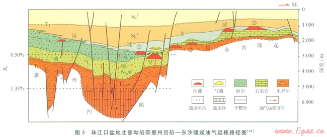 珠江口盆地北部坳陷帶(圖2、3)處于南海北部大陸邊緣陸架上,盆地基底是燕山期島弧帶,盆地形成經歷古近紀斷陷、新近紀坳陷與新構造期3個階段。其中始新統文昌組沉積末期盆地受到強烈改造,地層遭受較大規模剝蝕。盆地二級構造單元有珠一坳陷和珠三坳陷等。三級構造單元包括10多個凹陷和凸起。凹陷是潛在的生烴單元,但都比較破碎,多數凹陷被次級凸起進一步分隔成多個洼陷。洼陷才是最基本的生烴單元,多數洼陷呈“肉(古近系)厚皮(新近系)薄”特征。烴源巖為始新統文昌組中深湖相泥巖、漸新統恩平組湖沼相煤系地層[3],部分凹陷可能殘留有中生代海相—海陸過渡相烴源巖。該區域地溫梯度及大地熱流值分別為36.6±6.0℃/km和66.1±8mW/m2[15],屬于熱盆。始新統文昌組中深湖相泥巖烴源巖有機碳含量介于0.50%~4.88%,平均為1.22%,以偏腐泥混合型干酪根為主,埋藏深度處在生油窗范圍,主要生油,是主力生油巖;恩平組因埋藏淺、熱演化程度低在珠一坳陷生成少量石油,在珠三坳陷生成部分天然氣。因此主力烴源巖為始新統文昌組,比較單一,決定了以油為主的縱向分布特征[3]。已發現的生油洼陷有惠州26洼、陸豐l3洼、番禺4洼、恩平l7洼、珠三坳陷文昌B洼等。縱向上石油分布在基底組合、始新統文昌組—恩平組下組合、漸新統珠海組—下中新統珠江組中組合、中上新統粵海組—萬山組上組合。珠江口盆地北部新構造活動劇烈,石油晚期運移活躍,目前發現的石油主要集中在中組合,其他組合是下一步的油氣勘探方向。