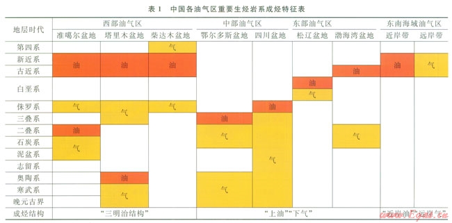 中國不同盆地群的盆地在縱向上有不同的油氣(包括常規油氣和非常規油氣)成烴樣式(表1)。如鄂爾多斯盆地油氣田呈“下氣(古生界)上油(三疊系—侏羅系)”格局、松遼盆地油氣田呈“下氣(下白堊統)上油(上白堊統)”格局,其他盆地也呈現出油氣田在空間上有序分布的特征(表1)。但以油氣區(盆地群)為單元,進而討論中國海陸總體油氣田分布規律的研究并不多見,而進一步歸納全國油氣田空間分布模式、揭示其成因,準確把握油氣田分布規律,對于指導油氣領域勘探有著極其重要的意義。