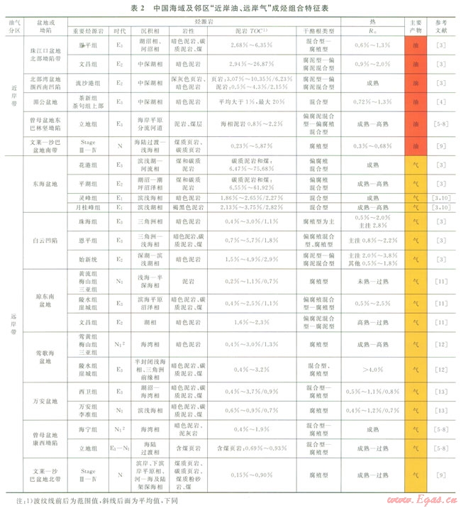 中國東南沿海油氣區指東海海域和南海海域油氣區。油氣區內盆地的基底是印支、燕山期造山帶,盆地屬于邊緣海盆地,結構呈斷陷—坳陷,充填的主要地層為新生界(局部有中生代殘留盆地)。盆地的烴源巖時代相對單一,主要發育一套古近紀—新近紀地層[2-13],在不同盆地生油氣性質不同,從油氣田分布看,可以分成近岸原油帶和遠岸天然氣帶(圖1、表2)。
