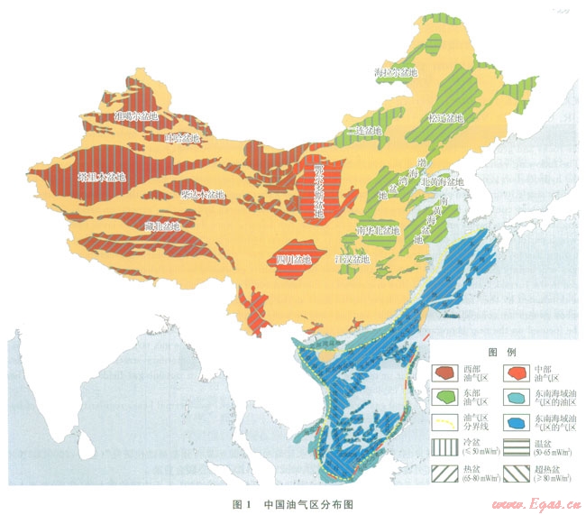 在“三橫四豎”的棋盤格局中,為構造 熱體制不同的沉積盆地群。處于東南沿海的東海海域盆地和南海海域盆地(東海盆地、臺西盆地、臺西南盆地、珠江幾盆地、北部灣盆地、鶯歌海盆地、瓊東南盆地、中建南盆地、萬安盆地、曾母盆地和文萊沙巴盆地等)基底主要為年輕的島弧褶皺帶,盆地為大陸邊緣盆地,現今大地熱流和地溫梯度高 特高,屬于熱盆和超熱盆。夾持在大興安嶺—太行山—武夷山板內造山帶與遼東—膠東—東南沿海造山帶之間的沉積盆地,包括了在古老結晶基底上的多期盆地(渤海灣盆地、南華北盆地、蘇北南黃海盆地、江漢盆地)及在海西褶皺帶上發育的斷陷 坳陷盆地(松遼盆地、南襄盆地等),現今大地熱流和地溫梯度高,屬于熱盆。處于賀蘭山—龍門山—橫斷山與太行山—武夷山造山帶之間沉積盆地,包括在古老結晶基底上的多期盆地(鄂爾多斯盆地、四川盆地),現今大地熱流和地溫梯度中等,屬于溫盆。賀蘭山—龍門山—橫斷山以西的、我國陸上的沉積盆地,包括了在古老結晶基底上的多期盆地(塔里木盆地)及在褶皺帶上發育的多期盆地(準噶爾盆地、吐哈盆地和柴達木盆地等),現今大地熱流和地溫梯度低,屬于冷盆。