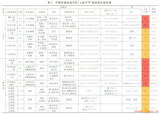 我國陸地區東部油氣區包括東北吉黑中新生代裂谷區(主要包括松遼盆地、海拉爾盆地、二連盆地、大楊樹盆地、三江盆地等,主要形成于晚侏羅世—白堊紀;僅依蘭—伊通地塹系形成于古近紀)、渤海灣盆地(主要包括下遼河坳陷、遼東灣坳陷、渤中坳陷、濟陽坳陷、黃驊坳陷、冀中坳陷、臨清坳陷、埕寧隆起、滄縣隆起、內黃隆起等,主體形成于古近紀)、南華北盆地、南襄盆地、江漢盆地、北黃海盆地和蘇北—南黃海盆地等(圖1)。這些盆地基底為克拉通基底或海西—印支褶皺區。盆地成盆期及其期次不同、各期盆地原型也不同,經歷的改造作用差異巨大,多為殘疊甕地,即多期原型盆地的殘余疊合在一起,烴源巖發育程度不同(表3)。受區域熱流場和埋藏作用的綜合控制,烴源巖經受不同的熱作用,導致下部層系烴源巖以生氣為主,上部層系烴源巖以生油為主,形成“下氣上油”兩類成烴模式。如松遼盆地白堊系下部生成天然氣、白堊系上部生成巨量石油,呈現出下生氣、上生油的格局;渤海灣盆地前新生代殘余盆地生成天然氣、古近系盆地生成巨量石油,也呈現出“下氣上油”的特點。