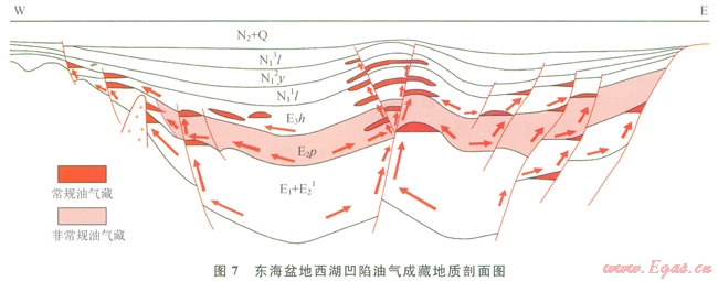 東海盆地位于東海陸架區,基底是燕山期陸緣花崗巖帶,新生代歷經裂陷期、坳陷期及新構造期3大構造階段。其中裂陷期為古新世—始新世,坳陷期為漸新世—中新世,上新世—第四紀為新構造期。東海盆地以新生代沉積地層為主,從古新統至第四系均有發育。該盆地經歷了5次主要構造改造作用,特別顯著的是發生過多期正反轉(圖6、7)。東海貧地呈二坳二隆構造格局。西部坳陷帶(長江坳陷、臺北坳陷)、中央隆起帶(虎皮礁隆起、海礁隆起、漁山東隆起)、東部坳陷帶(福江凹陷、西湖凹陷、釣北凹陷)和東部隆起帶(釣魚島隆褶帶,即陸架外緣隆起)。東海盆地形成于太平洋板塊俯沖導致的弧后擴張作用;隨著俯沖帶的不斷東撤,盆地內部呈由西向東逐漸變新的構造遷移特征,沉積—沉降中心逐漸東移,形成了凹陷之間構造—沉積演化的差異。古新世裂陷主要發生在東海盆地的西部坳陷帶,始新世—漸新世裂陷主要發生在其東部坳陷帶。