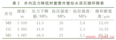 川中地區高壓天然氣井因Æl77.8mm尾管固井后,采用較低密度鉆井液替換井內鉆井液鉆開目的層而使作用在井內套管的內壓力大幅度降低。該區塊Æ177.8mm尾管固井時鉆井液密度約為2.20g/cm3,而下一次開鉆鉆進時,鉆井液密度降至1.35g/cm3左右。M8、G2、M9井Æl77.8mm尾管固井,氣層封固質量優良,候凝過程未發生氣竄,但井內壓力大幅度下降后,喇叭口竄氣。該區塊水泥石楊氏模量10GPa,泊松比0.19,其余計算條件及結果如表2所示。以套管壁處水泥環徑向拉應力達到抗拉強度為形成微環隙的臨界條件[7-8],由公式(3),計算出井內壓力下降幅度超過40MPa后,3口井形成寬度l3.09~20.24mm的微環隙,密封能力顯著降低。