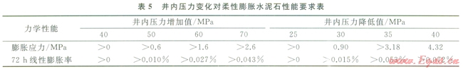 井下作業公司柔性自應力水泥石能在高圍壓條件下膨脹,產生0.5~3.0MPa膨脹壓應力,楊氏模量在5~7GPa,泊松比約為0.19,抗拉強度在2.5~3.5MPa。當固井后井內壓力增加時,通過釋放壓縮應力,減小水泥環周向拉應力,避免拉伸破壞,同時外觀體積微膨脹,可阻止微環隙形成。由公式(1)、(2)計算出表5所示不同井內壓力變化情況下柔性膨脹水泥石體積膨脹要求。該水泥漿體系在相國寺儲氣庫井技術套管、頁巖氣井的油層套管固井中得到了成功應用,固井質量優質,在經過試壓、大型體積壓裂作業后,環空封固質量好,未發生氣竄。