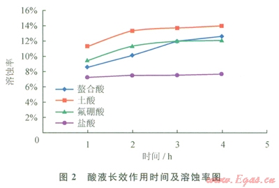 實驗設計了4種酸液與某油氣田沙河街組儲層的巖粉反應,對比在1h、2h、3h、4h酸液對巖粉的溶蝕率,以及最終的溶蝕率,研究螯合酸液體系的緩速性能。實驗溫度l30℃,實驗4種酸液分別為:10%HCl、10Y00 HCl+2%HF、10%HCl+8%HBF4、l0%螯合酸。實驗結果表明(圖2):鹽酸與巖粉反應速率最快,溶蝕率最低,土酸與巖粉反應溶蝕率最高,在2h反應基本完成,氟硼酸溶蝕率比螯合酸略低;鹽酸溶蝕率基本保持在7.5%,土酸溶蝕率在2h變化較大,之后基本無很大變化,溶蝕率最高達l3.9%,螯合酸表現出明顯的緩速性能,隨著反應時間延長,螯合酸溶蝕率逐漸升高,最高達l2.6%。