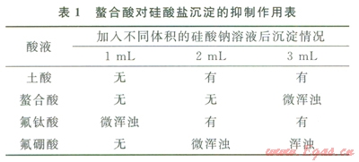 從表l可以看出,氟鈦酸在第一次加入硅酸鈉溶液就產生微渾濁,土酸與氟鈦酸在第二次加入硅酸鈉就產生沉淀,氟硼酸出現少量渾濁,螯合酸在第三次加入硅酸鈉才出現微渾濁,說明螯合酸對硅酸鹽沉淀的抑制性能好。