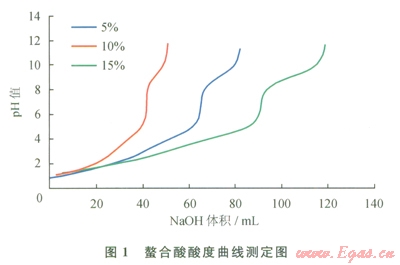 鈣、鎂、鋁離子螯合能力測試方法為取10mL螯合酸于蒸餾水中,稀釋到250mL并置于250mL容量瓶中,加入5%NaOH調節pH值為l0~11,加入10mL的Na2CO3(2%)溶液,緩慢加入0.25mol/L的CaCL溶液,直到沉淀不再增加,記錄CaCL溶液的消耗量,在滴加過程中加入NaOH溶液,使pH值始終處于l0~11之間,平行測試3次,取平均值。