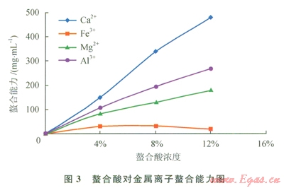 螯合酸對鈣離子螯合能力最強,對鐵離子螯合能力較弱,隨著螯合酸濃度的升高,對鈣、鎂、鋁螯合能力逐漸增強,當螯合酸濃度為l2%時,鈣離子螯合能力最高達到480mg/mL,鎂離子螯合能力180mg/mL,鋁離子螯合能力268mg/mL,對鐵離子螯合能力隨著螯合劑濃度增加而降低,濃度8%時鐵離子穩定能力為30mg/mL,濃度l2%時為17mg/mL,綜合螯合酸對幾種金屬離子的蝥合能力,當螯合劑濃度為l0%,可以實現對4種金屬離子高效螯合(圖3)。
