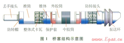 速鉆橋塞包括丟手機構、錨定機構和密封機構,主要由丟手接頭、防轉帽、推筒、整體式卡瓦、錐體、保護套、外膠筒、中膠筒、防轉接頭、泵送環等零件組成,結構如圖1所示。