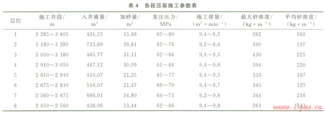 該井8段壓裂施工共注入地層液體總量3949.44m3,加入陶粒207.93m3,最高施工壓力80MPa,最高砂濃度394kg/m3,最大施工排量9.8m3/min。各段壓裂施工參數如表4所示。
