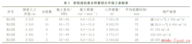 自主研制生產的新型速鉆復合橋塞已成功應用已20余井次,橋塞動作靈活,密封可靠,鉆磨效率高,表2為其中5口井的施工參數,下面針對某一實例井的應用情況進行分析。