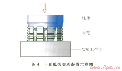 將新型復合橋塞錐體錐入卡瓦,放在拉壓實驗機實驗工作臺上(如圖4所示),拉壓機向錐體緩慢垂直加載直到卡瓦破裂,測試卡瓦破裂所需載荷[8]。經反復10次測試實驗,卡瓦沿應力槽破裂,破裂加壓載荷為25~30kN。