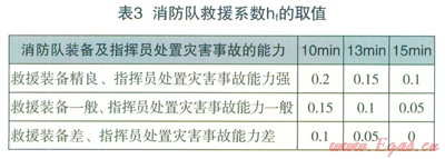 消防隊(duì)對(duì)燃?xì)馐鹿实慕禐?zāi)作用,表現(xiàn)為消防隊(duì)的反應(yīng)時(shí)間和消防隊(duì)的裝備及指揮人員的對(duì)災(zāi)害事故的處置能力兩個(gè)方面。結(jié)合我國(guó)消防隊(duì)到達(dá)現(xiàn)場(chǎng)所用的一般時(shí)間標(biāo)準(zhǔn)以及消防救援裝備和指揮能力評(píng)判,消防隊(duì)救援系數(shù)hf的取值見表3。
