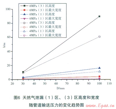 DN900在運(yùn)行壓力6.0MPa,輸氣能力為74.3萬m3/h的高壓天然氣輸送管道(管壁厚度l0mm),埋地深度1.2m,泄漏點(diǎn)孔徑30mm時(shí),天然氣泄漏口速度較大,屬超聲速天然氣氣流在空氣中的射流擴(kuò)散,因此,在高度方向的擴(kuò)散遠(yuǎn)大于在水平方面的擴(kuò)散。如圖4所示,在泄漏5s時(shí),天然氣高度已達(dá)150m;25s天然氣已擴(kuò)散至大于250m的高空;50s其在250m下的空間擴(kuò)散形狀趨于定常,即形狀隨時(shí)間推移基本一致。圖5給出了泄漏口l00mm、30mm條件下天然氣泄漏(1)區(qū)、(3)高度和寬度隨輸送壓力的變化曲線圖。從模擬計(jì)算結(jié)果可以看出,隨著輸送壓力的增大,在相同泄漏口條件下,泄漏天然氣流量增大,導(dǎo)致(1)區(qū)、(3)高度和寬度增大。圖6給出了天然氣泄漏(1)區(qū)、(3)高度和寬度隨泄漏口直徑的變化趨勢(shì)圖,圖中表明:在相同輸送壓力下,泄漏口直徑增大,相當(dāng)于泄漏天然氣流量增大,導(dǎo)致(1)區(qū)、(3)高度和寬度增大。