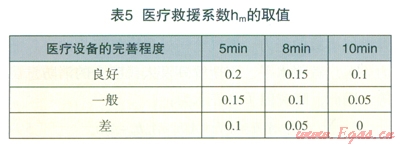 醫(yī)療機(jī)構(gòu)對(duì)燃?xì)馐鹿实慕禐?zāi)作用,表現(xiàn)為醫(yī)療機(jī)構(gòu)到達(dá)現(xiàn)場(chǎng)的急救反應(yīng)時(shí)間和醫(yī)療設(shè)備的完善程度兩個(gè)方面。根據(jù)急救時(shí)對(duì)傷者的救治效果,表示醫(yī)療救援系數(shù)的取值見表5。