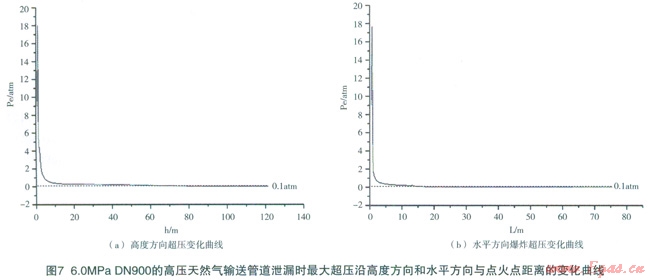 泄漏天然氣發(fā)生燃燒爆炸時(shí),爆炸氣云將形成巨大破壞作用的爆炸超壓,當(dāng)超壓0.1atm時(shí),就可造成橋梁、救生艇等破壞;當(dāng)超壓0.35atm時(shí),可以將戶外人員吹走或埋入廢墟,具有50%的致命率,可嚴(yán)重破壞建筑物或工廠。通常以超壓0.1atm作為危險(xiǎn)的臨界條件。圖7給出了DN900運(yùn)行壓力6.0MPa,輸氣能力為74.3萬m3/h的高壓天然氣輸送管道泄漏點(diǎn)孔徑100mm,泄漏時(shí)間10min條件下,氣云爆炸最大超壓隨高度以及水平距離的變化曲線。圖中計(jì)算結(jié)果表明:在初始點(diǎn)火后,迅速形成爆轟,并達(dá)到約l8atm的超壓;隨著高度的增加,超壓先明顯衰減,隨后緩慢衰減,大約距地面66.5m高度超壓衰減至0.1atm。水平方向,在點(diǎn)火點(diǎn)附近,由于爆轟的存在,超壓高至約l8atm左右;隨著遠(yuǎn)離點(diǎn)火點(diǎn),超壓也是先明顯衰減,隨后緩慢衰減,在距離點(diǎn)火點(diǎn)l5.6m處,超壓降至0.1atm。