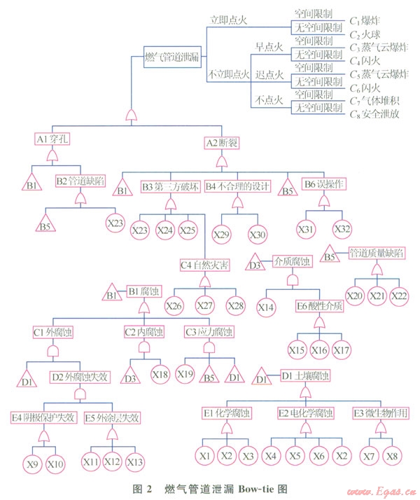 城市燃氣管道的風險取決于管道失效的可能性和事故后果的嚴重性[3],為將燃氣管道事故的前因后果結合起來進行風險評價,首次引入Bow-tie模型,將風險分析中的故障樹和事件樹聯系起來。Bow-tie模型最早出現在澳大利亞昆士蘭大學關于帝國化學,工業公司危害分析的課程講義[4],隨后殼牌公司將其應用于阿爾法鉆井平臺爆炸災難分析中[5],至今這一技術已被廣泛應用到一些重大事故。