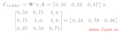 在計算結果事件后果影響時將后果因素的權重與其相應的評價模糊數按矩陣乘法進行合并[13]。如C1事件造成的第二級因素人員傷亡的后果計算如下。