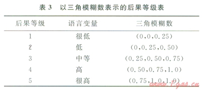 首先邀請有經驗的專家組成評價小組,冉對專家進行權重分析,本文僅以兩位專家為例,并且賦予其相等的權重。依據故障樹中基本事件和事件樹中誘發事件的風險大小,由號家賦予每個事件相應的三角模糊數,評價結果見表4,然后根據式(5)求得聚合后的事件模糊數。