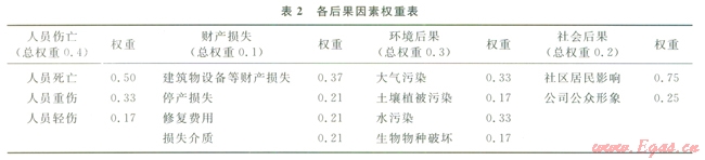 應用本文參考文獻[12]中的公式求得權重為(W人員傷亡,W財產損失,W環境后果,W社會后果)=(0.4,0.1,0.3,0.2),同理求得第二級因素的權重(表2)。