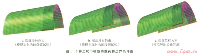 1)經(jīng)過分析可知,3種工況下管道兩端的約束各不相同:加封頭的爆破試驗(yàn)管道兩端橫截面受軸向應(yīng)力;端部密封的爆破試驗(yàn)的管道兩端可以忽略管道兩端所受的軸向應(yīng)力,近似認(rèn)為不受約束;埋地長(zhǎng)輸管道兩端沒有軸向應(yīng)力的約束,管道軸向位移為零。