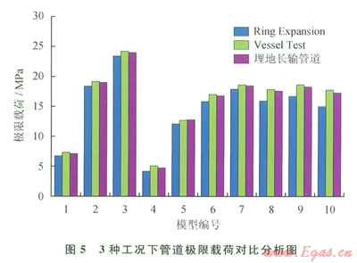 基于已確定的適合高強(qiáng)度管道的失效判據(jù),采用有限元分析方法模擬3種工況下管道的失效情況。圖5對(duì)3種情況下計(jì)算出的極限載荷做了對(duì)比分析。表4為3種丁況下管道極限載荷的對(duì)比值,通過對(duì)比分析可看出:加封頭的爆破試驗(yàn)與埋地管道的預(yù)測(cè)極限載荷吻合度更高,l0組誤差的標(biāo)準(zhǔn)偏差值為2.06%;兩端密封的爆破試驗(yàn)比埋地管道的預(yù)測(cè)極限載荷要小,l0組誤差的標(biāo)準(zhǔn)偏差值為3.64%。在實(shí)際工程試驗(yàn)中,建議用加封頭的爆破試驗(yàn)來預(yù)測(cè)埋地管道的極限載荷;用兩端密封的爆破試驗(yàn)來預(yù)測(cè)真實(shí)埋地管道的失效情況,得到的預(yù)測(cè)結(jié)果偏保守。