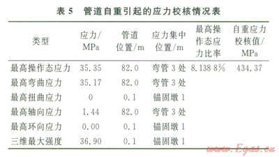 由表2~5可知,最高操作態綜合應力產生在管道彎管3處,管道系統單元l70~180即管道76~82m處的最高操作態應力為397.46MPa,最高操作態應力比率為91.5034%,綜合應力主要產生在彎管3處,一次、二次應力及綜合應力校核最高節點應力均未超過434.37MPa,滿足管道的強度和柔性要求。