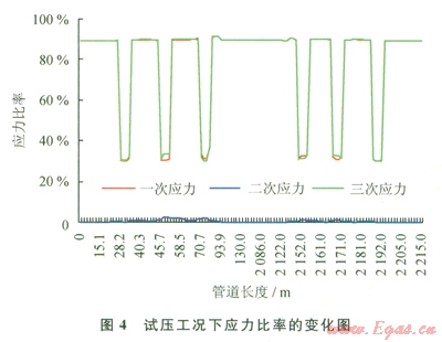 3)一次應力占管道綜合應力的97.12%,故占管道應力的大部分。同時,在管道自重對一次應力影響的校核中,管道自重占一次應力的8.9%,所占比例較小。因此,管道內壓是產生一次應力的主要因素。在一次應力校核中發現應力集中點在管道彎管3處,由于一次應力反映的是管道內壓和管道以及管內介質的自重對管道應力的影響,因此,在試壓工況下,影響管道應力的最主要因素是管道內壓。
