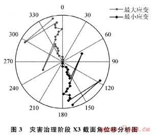 首先,管體應(yīng)力釋放要控制在合理范圍內(nèi)。一定長度內(nèi)的管體應(yīng)變既然已發(fā)生,就很難再回復(fù)到初始狀態(tài);過度的釋放有可能會加劇該管段的力學(xué)損傷,甚至影響相鄰管段的穩(wěn)定和安全。換言之,管體的應(yīng)力釋放是以減緩并消弱災(zāi)害風(fēng)險為目標(biāo)的,而不是像改線那樣去根除風(fēng)險。治理階段的應(yīng)變動態(tài)監(jiān)測可以控制應(yīng)力釋放的程度。其次,管體應(yīng)力的釋放要從低應(yīng)變區(qū)逐段向高應(yīng)變區(qū)迫近,而不是直接開挖管道變形最為劇烈的管段,否則有可能導(dǎo)致管體在卸載后大幅度振蕩,加劇管體損傷。隨著管溝的逐段開挖,該管段應(yīng)力分布也會發(fā)生即時變化,此時的應(yīng)變監(jiān)測數(shù)據(jù)可指導(dǎo)開挖進度和開挖位置調(diào)整。最后,采用管道應(yīng)變監(jiān)測還可以獲得管線各監(jiān)測截面實時應(yīng)變極值的角度(如圖3),即角位移分析。角位移分析圖能夠清晰地表明最大應(yīng)力的方向、管道彎曲的方向,以及整個管段彎曲扭轉(zhuǎn)的狀態(tài)及趨勢,進而指導(dǎo)對管體進行細(xì)微的挪移。