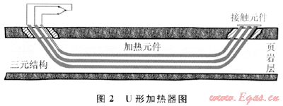 不同于Y形加熱器的位列方向,U形加熱器將3個(gè)加熱器在地面上以三角形方式水平排列(圖2)。該加熱器利用了較長的、大體上水平的加熱器支腿長度,可用來開采較薄層的油頁巖礦層,缺點(diǎn)是鉆多個(gè)水平井和斜向井,成本較高,不容易實(shí)施。