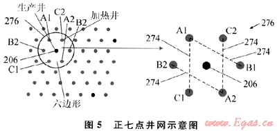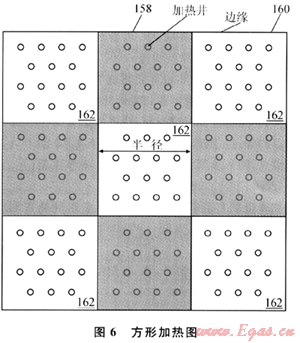 圖7為加熱井的另外一種陣列形式。在同心環(huán)形式的體積中,隨著環(huán)形體積向外移動(dòng)其周長逐漸增大。所以間插加熱可減少外環(huán)體積的地層熱膨脹。